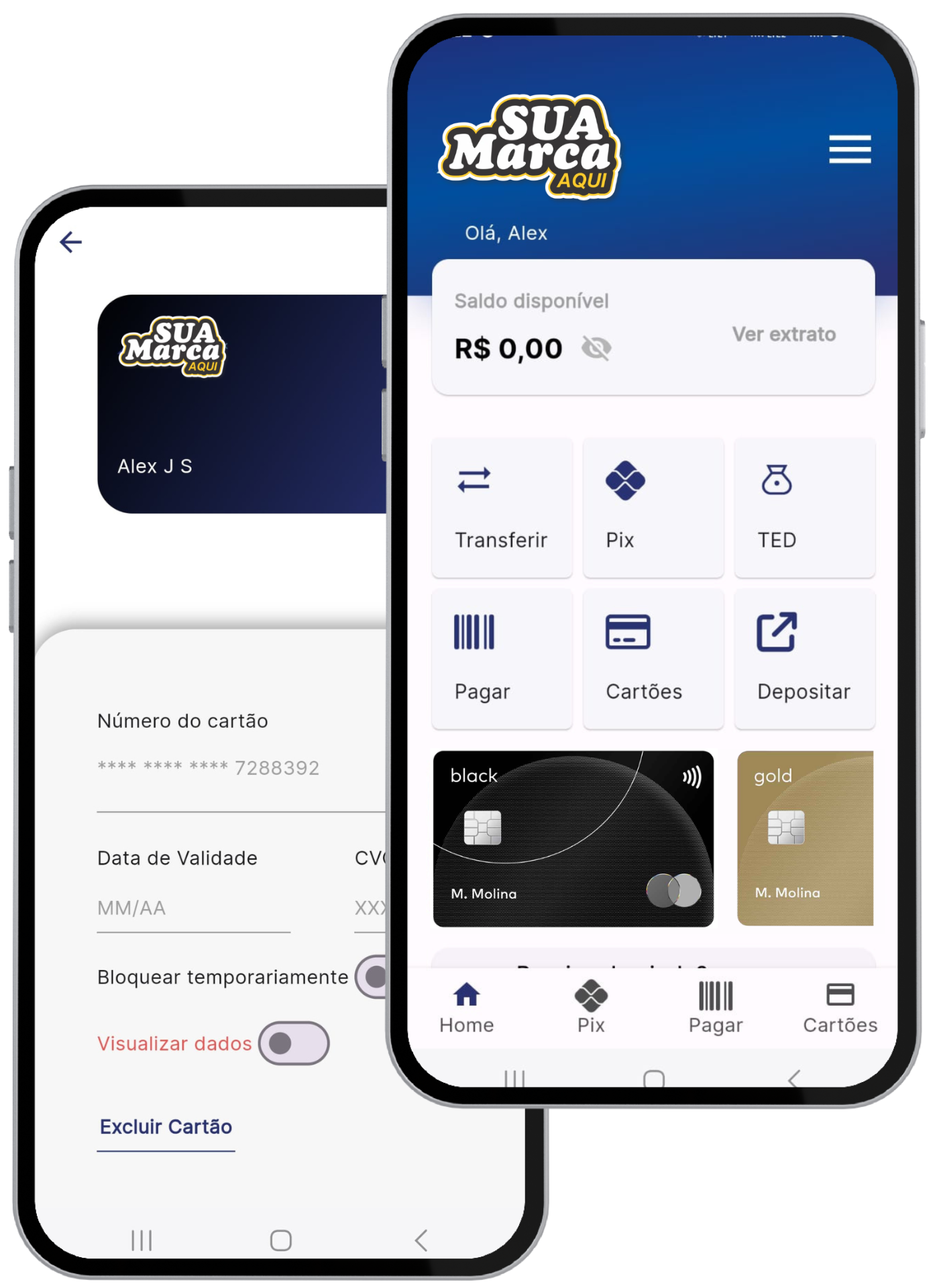 Personalize tudo, desde seu logotipo e cores até a tipografia, garantindo que sua plataforma de banco on-line esteja alinhada ao estilo visual da sua marca. Crie uma experiência coesa para seus clientes, sem esforço.