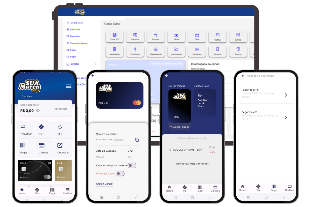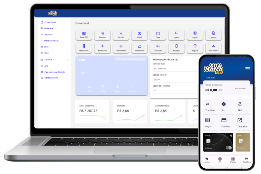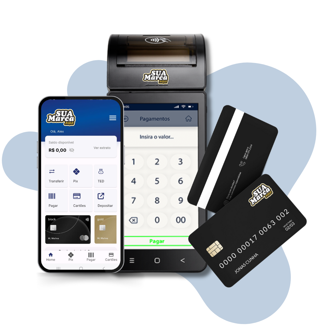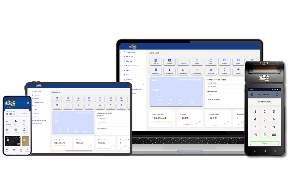 Com a nossa tecnologia, você tem tudo o que precisa para expandir seu BANCO DIGITAL e suas MAQUININHAS de cartão com menores taxas, aplicativo, conta digital, além de suporte técnico e estratégico.